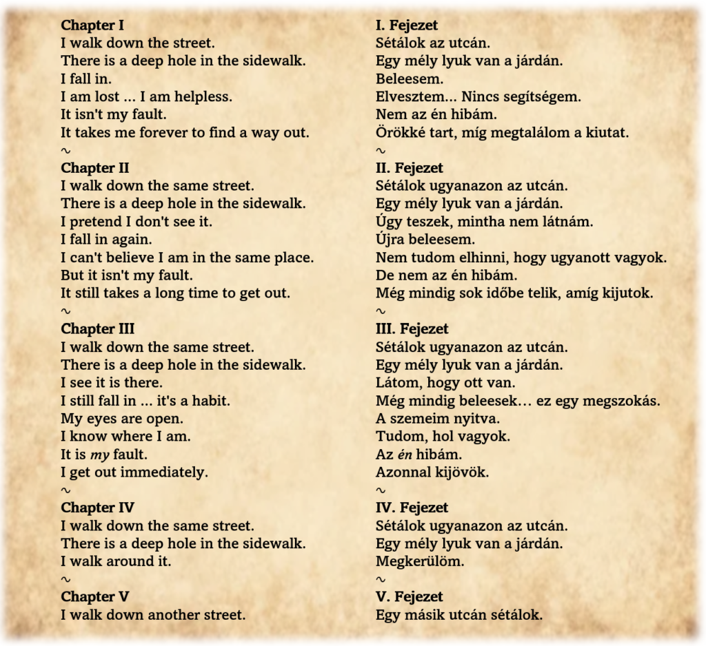 Az írás nagyon találóan érzékelteti az önismeret folyamatát, azt, hogy hogyan vagyunk jelen saját történeteinkben, milyen tudatossággal és önreflexióval vagyunk képesek rálátni a velünk történtekre (általában) az eltérő önismereti szinteken, de megmutatja a fejlődés és gyógyulás folyamatát is! A példák jól bemutatják, hogy milyen fázisokon megyünk keresztül amíg változunk és fejlődünk, de hogy a végén bármilyen gödörből ki tudunk önállóan is mászni, mert az önismeret útján haladva egyre tisztábban merjük meglátni a valóságot.